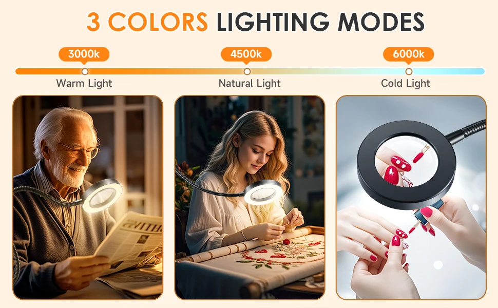 Desk magnifying glasses with bright LED lights, easily can be adjusted between 10%-100% of brightness through the button. 3 different colour modes( white, white&warm, warm) to choose from according to your preference and environment.