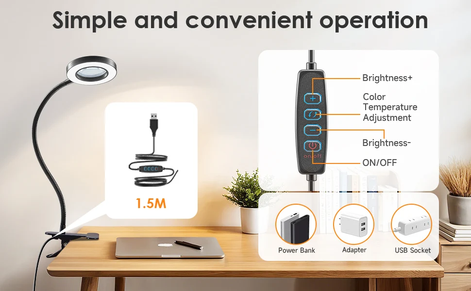 Designed WithUSB cable, it can be plugged into any available USB port switch. USB powered, no batteries or charging required. Long USB cable, no more worrying about the distance between the clip on light and the socket.