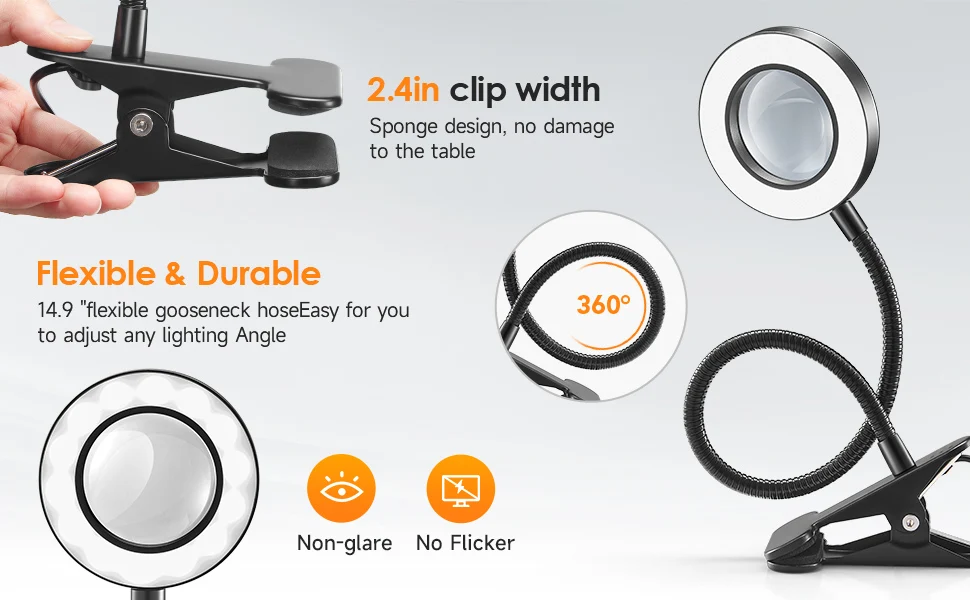 Flexible neck design allows you to adjust the magnifying glass 360 degrees, making it easy to direct the light where you want it for optimal viewing. Metal flexible neck, wear-resistant and durable.