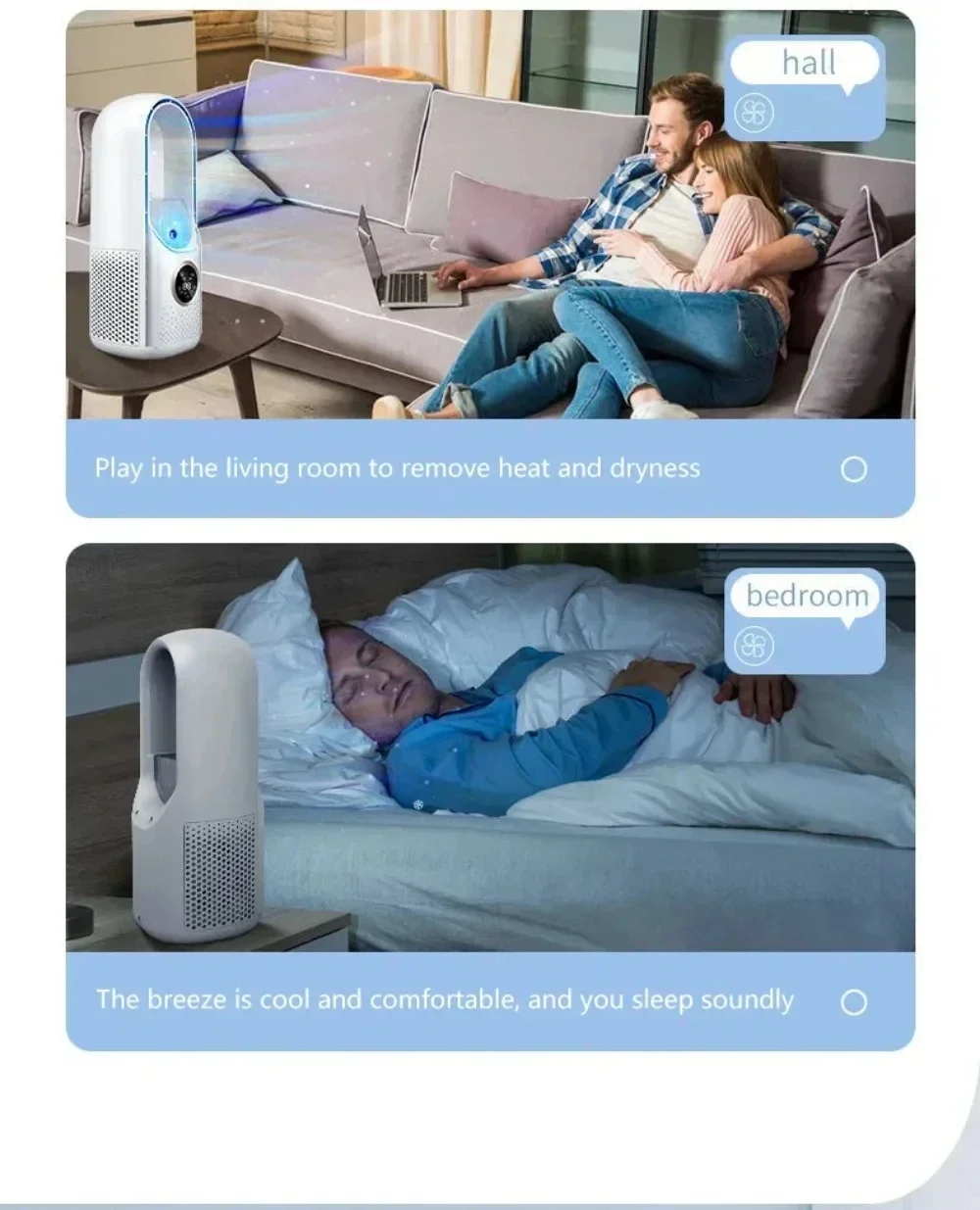 1. Quick cooling: This desktop bladeless fan has a built-in large-capacity water tank that can be filled with water for spraying. The fine water mist design can effectively reduce the surrounding temperature. 2. Multi-speed adjustment: This bladeless fan is designed with 6 speed and an ordinary button design, which can be easily adjusted with one button. 3. Spray Design: This desktop bladeless fan comes with a spray design. The cool breezes brings enough moisture to keep the skin moisturized at all times. 4. Timing design: The desktop bladeless fan adopts a timing design of up to 6 hours and can be turned off at a scheduled time. You can choose the time according to your preference. 5. Low noise: The desktop bladeless fan operates stably, has low noise, and does not affect daily life. Colorful night lights are also designed to create a good atmosphere.