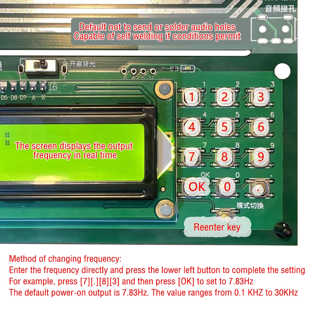 Directly enter the frequency and press the lower left key to complete the setting. For example, press [7][.][8][3] and then press [OK] to set it to 7.83Hz. The default power-on output is 7.83Hz, and the setting range is 0.1~30KHz.