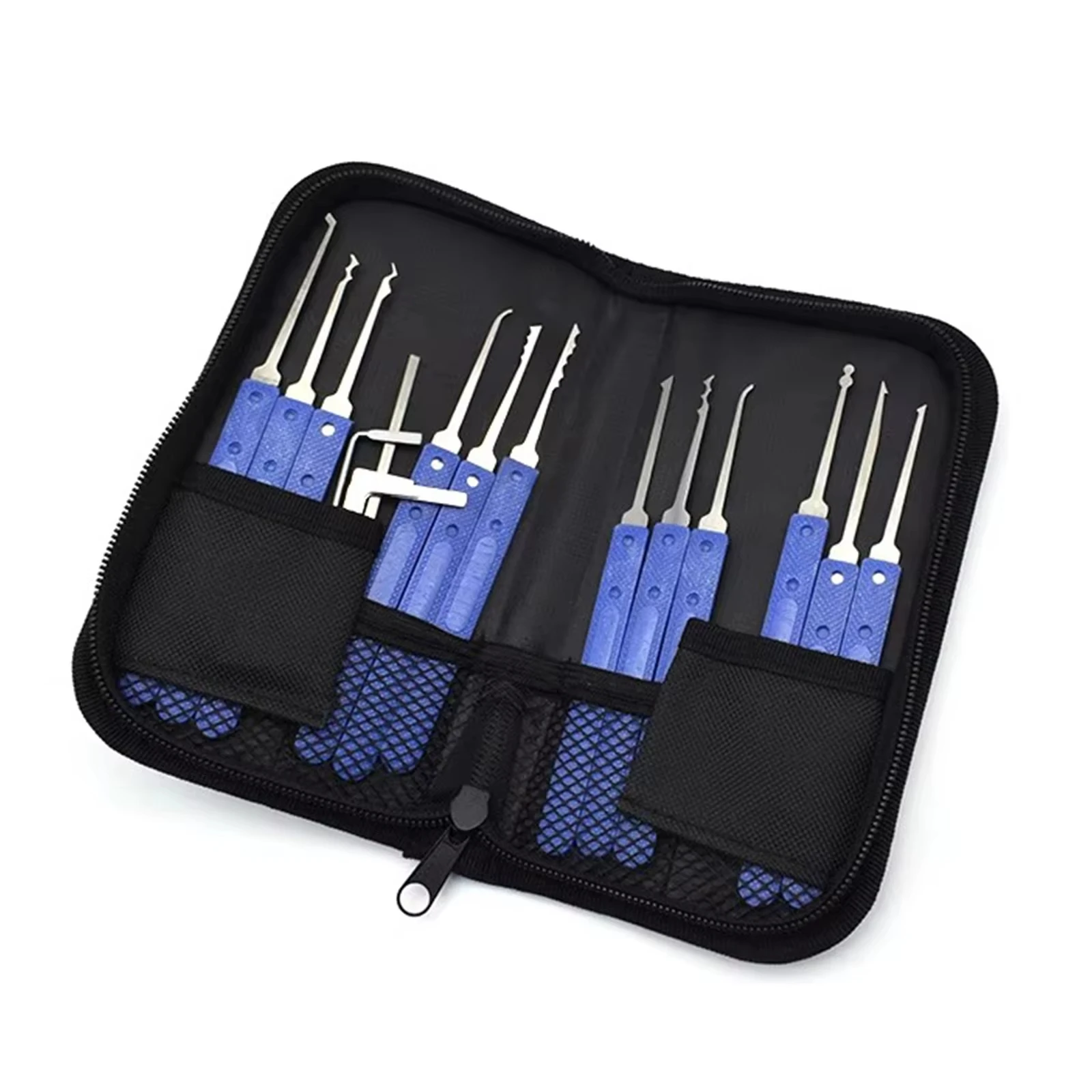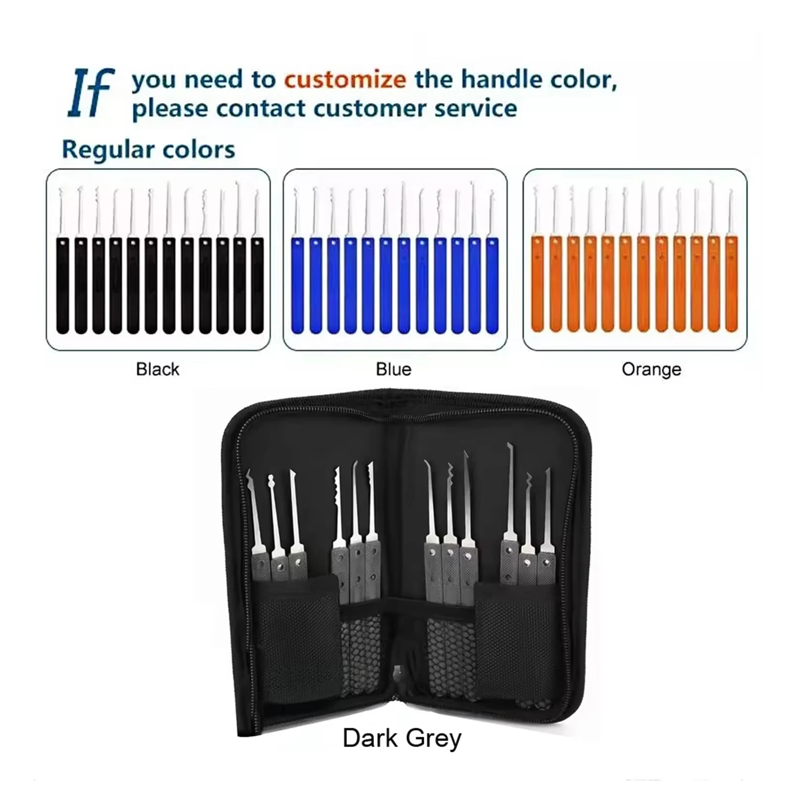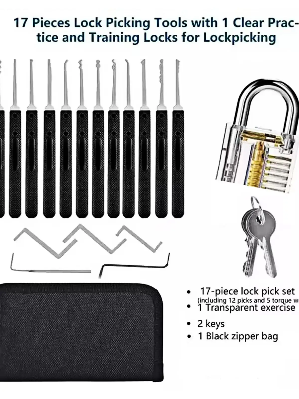 Features:1. Designed for a wide variety of locks2.3. Made of high-grade stainless steel and iron, reliable and durableReinforced anti-slip handles for added convenience4. The lock pick tools are all in different shapes, very strong and sturdy for various tough work5. Perfectly suitable for professional locksmiths or beginners6. Compact size, easy and convenient to carrySpecifications:-100% new and high quality-17pcs Locksmith Tool Kit and 1set Transparent Training Lock-Material:Stainless steel+ABS-Color:black,blue,grey,orange(optional)-Category: Locksmithing and Security Tools-Design: Ergonomic and Portable-Usage: Beginner-Friendly Lock Picking and Broken Key RemovalPackage included:1sets* Locksmith Tool Kit1 *Exquisite packaging