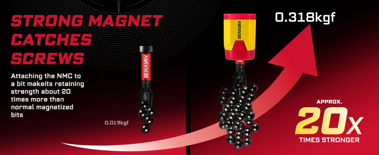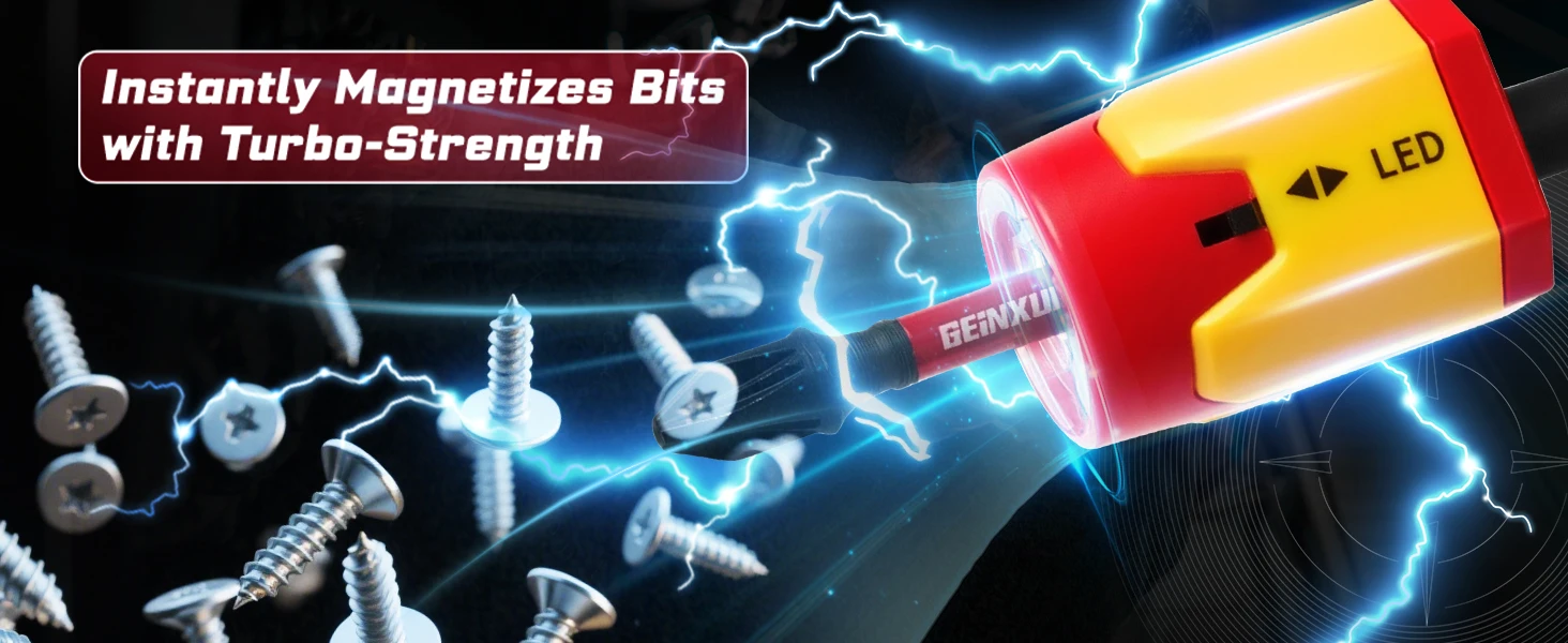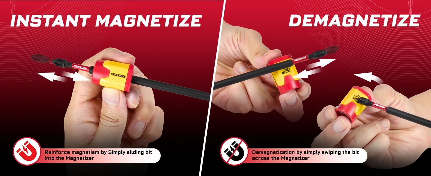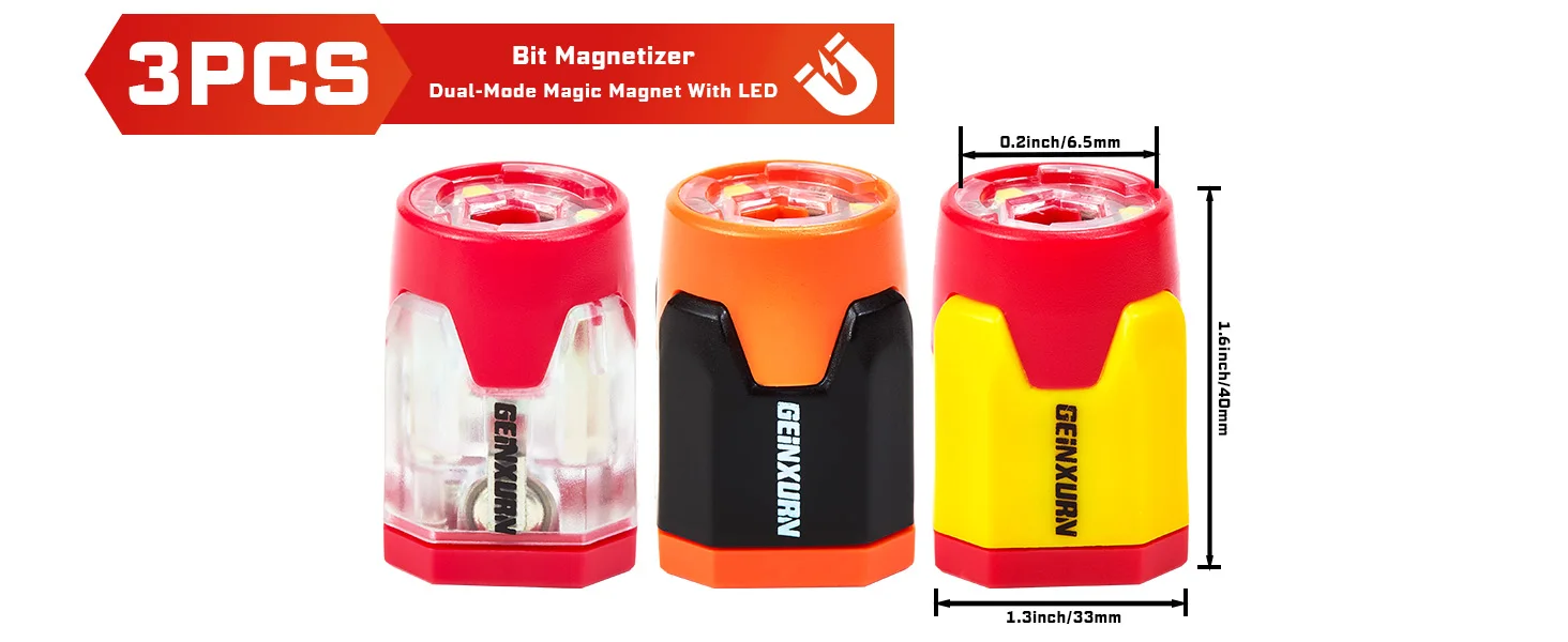 Geinxurn LED Screwdriver Bit Magnetizer Ring3PCS Bit Magnetizer Dual-Mode Magic Magnet with LED(Yellow,Orange,Red)LED Take Light : No more struggle in dark placeInstantly Magnetizes Bits with Turbo-StrengthConstructed with high-impact ABS plastic for superior durability, impact resistance, and long-lasting performanceStrong magnet catches screws: Attaching the NMG to a bit makeits retaining strength about 20 times more than normal magnetized bitsApplicable screwdrive bit : Work Seamlessly With HEX/ TORX/ SLOTTEO/ PHILLIP BITS and moreInstant magnetize : Reinforce magnetism by Simply sllding bit into the Magnetizer