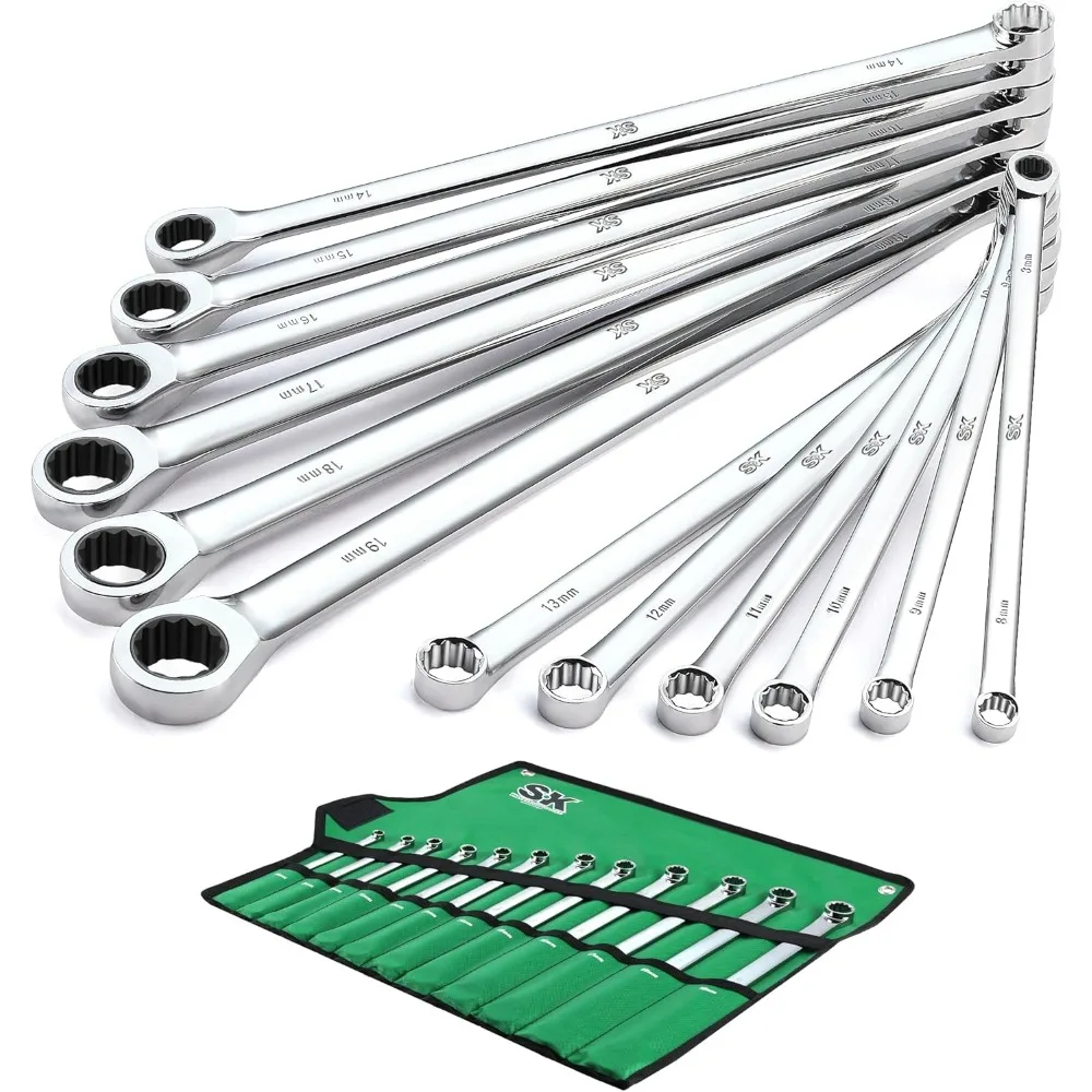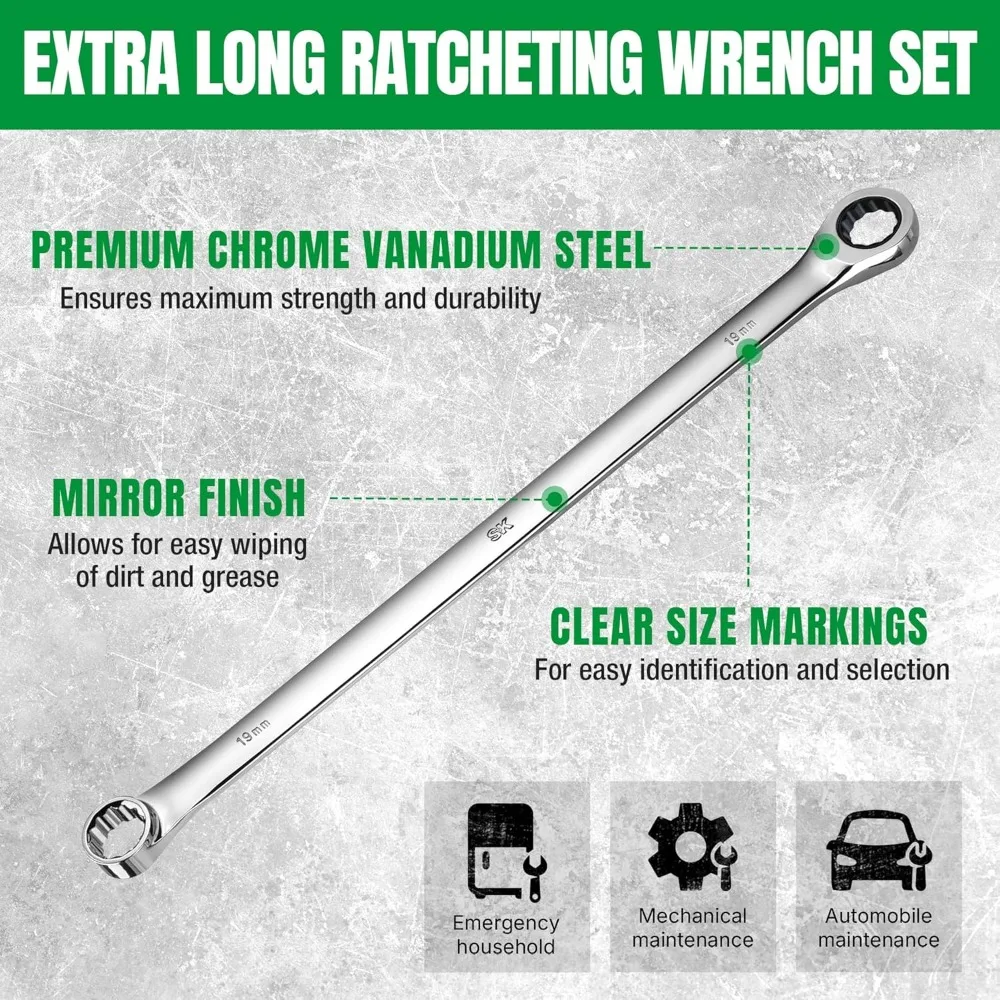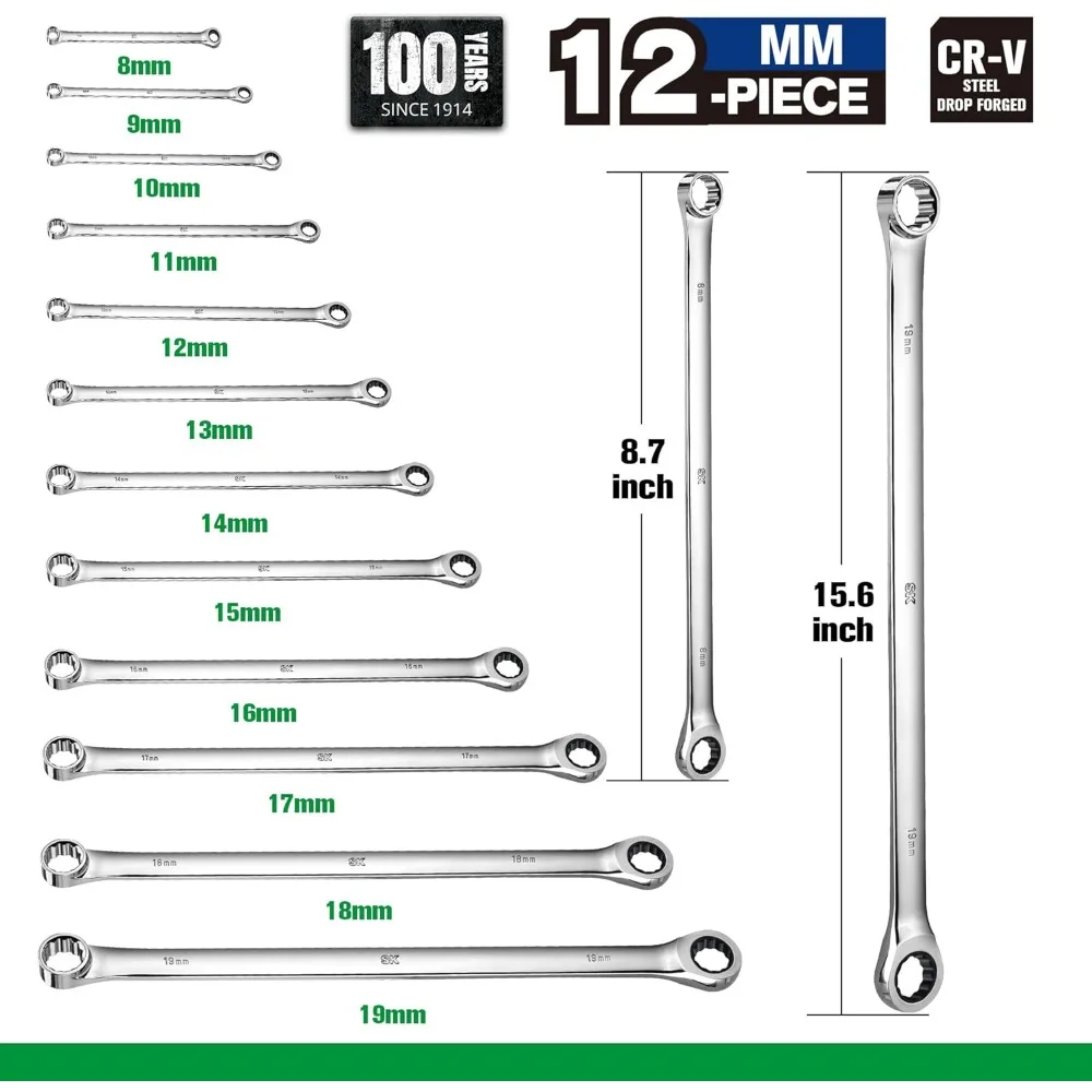 Extra Long Ratcheting Wrench Set, Double Box End Wrench Set, 12-Piece, Metric, 8 mm to 19 mm, 72-Tooth, Premium CR-V Constructi