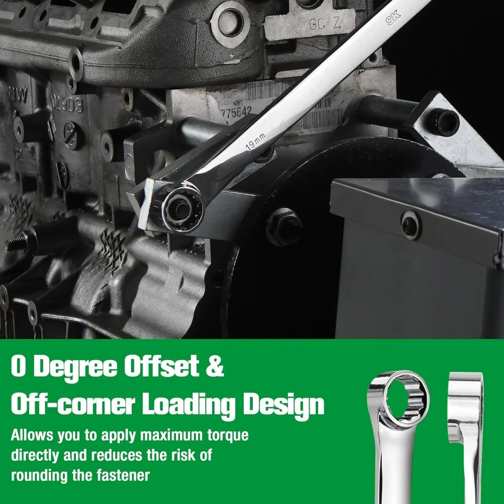 This box end wrench set includes: 8 mm, 9 mm, 10 mm, 11 mm, 12 mm, 13 mm, 14 mm, 15 mm, 16 mm, 17 mm, 18 mm, and 19 mm. The clear size markings are stamped on the wrench for easy identification and selection