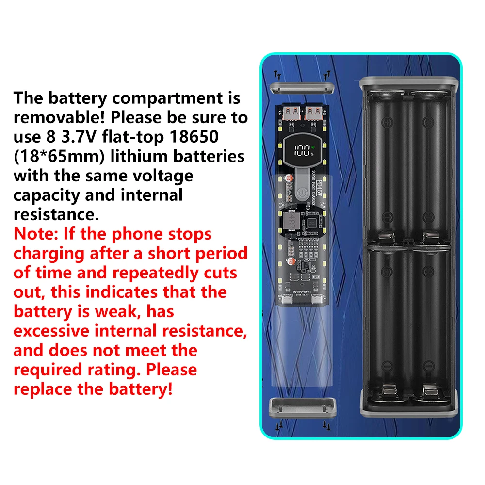 Note: The product only allows the installation of 21700 (21 * 70MM) flat battery, voltage between 3.5V-4.2V, more than two years of batteries, the number of cycles more than 300 times the battery, basically does not last; found that charging intermittently, only a few minutes, ten minutes, half the time the cell phone can not be charged, these are all the reasons why the battery is over-performing. In addition the product does not support modification, welding. If the use of non-compliant batteries are not responsible for after-sales. The motherboard is retrofitted with an anti-reverse connection chip, installing the reverse does not burn the motherboard, but due to the spring shrapnel is one piece, the battery broken skin, battery short-circuit, a positive and a negative, series connection will cause the burn spring, but re-installed correctly, the motherboard can always be used normally, will not burn.