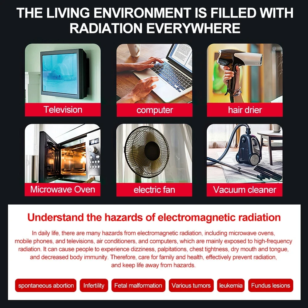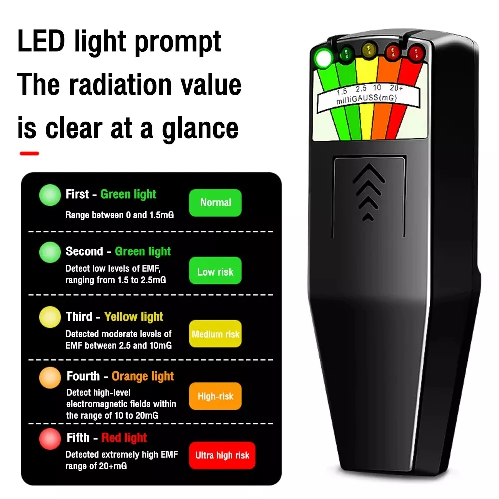 1. Special function 5-LED indicator light represents different radiation values. Application of 50/60Hz frequency monitoring, dark green 0 to 1.5 mgauss; green light 1.5 to 2.5 mgauss; yellow 2.5 to 10 mgauss; orange 10 to 20 mgauss; red 20 + mgauss.