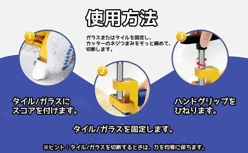 【3ステップ簡単な操作】1.タイル/ガラスにスコアを付けます。 2.タイル/ガラスを固定します。 3.ハンドグリップをひねります。ヒント:タイル/ガラスを切断するときは、力を均等に保ちます。