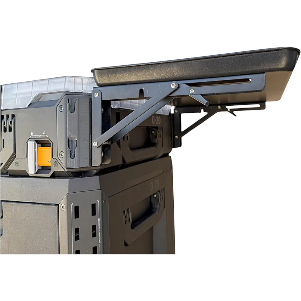 This product is proudly manufactured in the United States. The steel table is designed for easy detachment, perfect for navigating tight spaces such as narrow doorways or staircases, as demonstrated in the product video. The folding table can be quickly attached to either side of your boxes and removed in seconds. It features height adjustability, exceptional rigidity, and can support up to 100 lbs. Measuring 12 inches long by 16 inches wide by 1 inch tall, the steel table offers a spacious work area of 192 square inches for your projects and tools. Please note that the kit does not include Stack Tech boxes, one detachable table, and related accessories; these items are sold separately with each kit purchase.