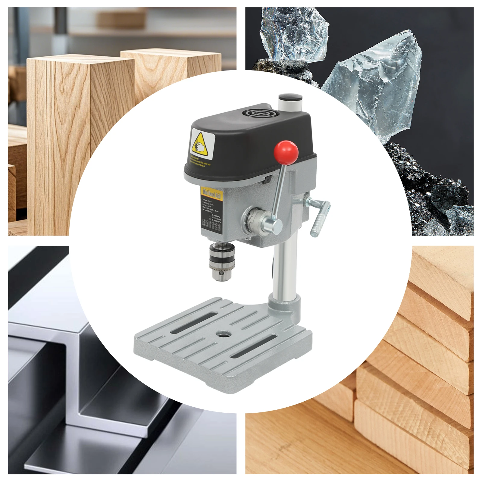 It can be used for drilling iron (diameter ≤0.24in), wood (diameter ≤0.63in), plastic board, aluminum board, composite board, resin board, thin metal, circuit board, and other non-rigid materials. It can also be used for teaching experiments, DIY crafts, or furniture, such as Buddhist beads, shells, crystals, toy models, and so on.