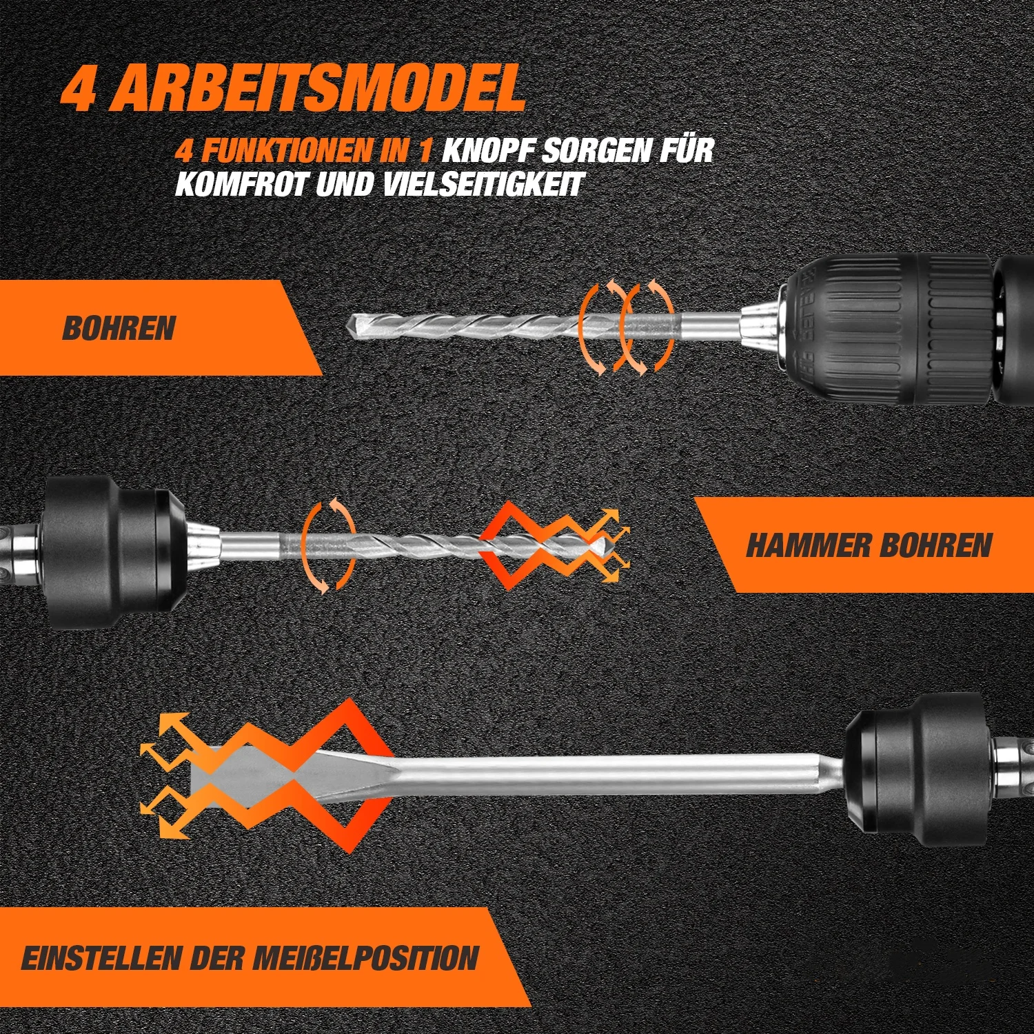 4 MODES: Multi-function selector offers 4 modes of operation. Rotation-only, rotary hammer, hammer only mode, and chisel position adjustment.