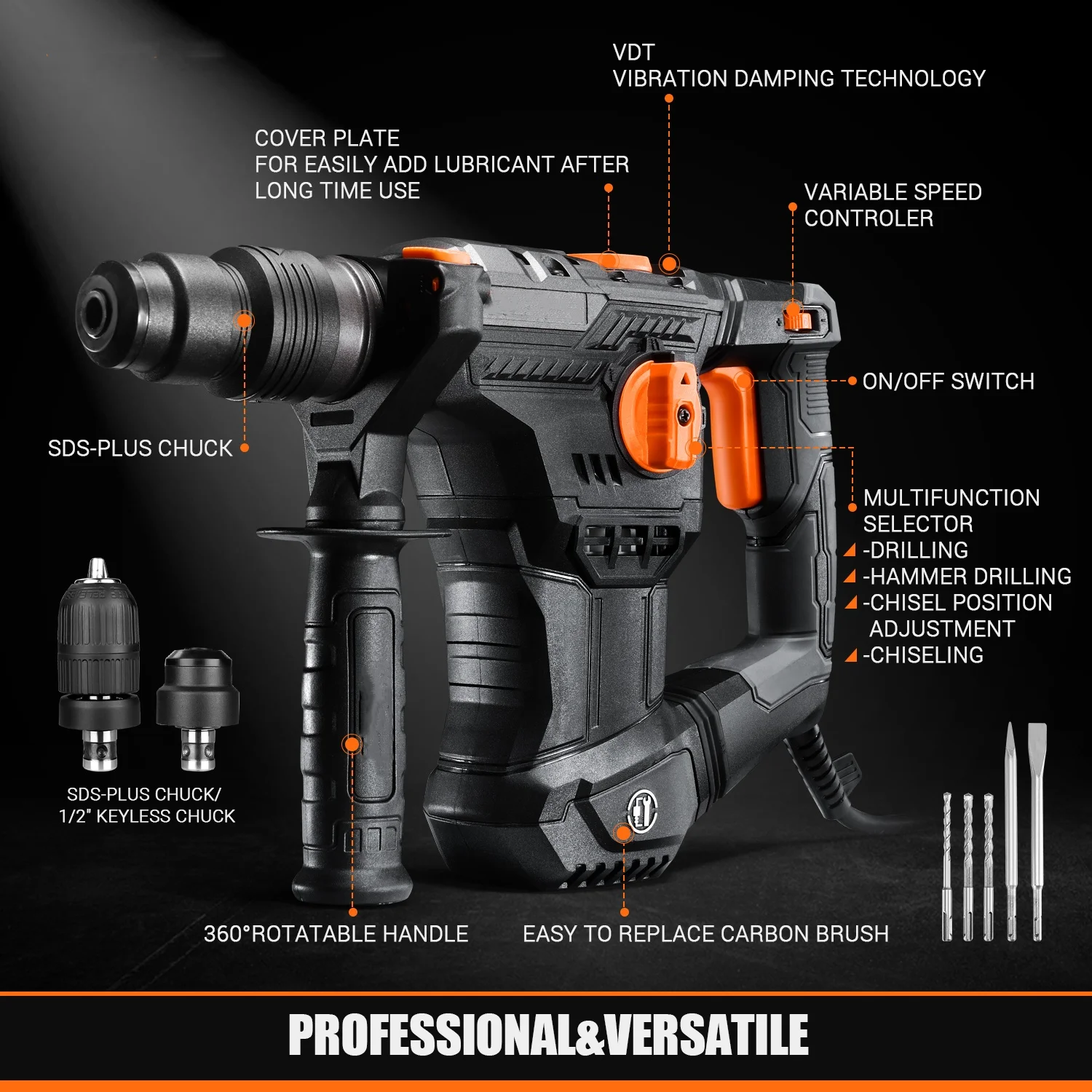 What You Get: (1) Rotary Hammer Drill (Only suitable for 120V), (1) SDS-Plus Adaptor, (1) Chuck Key, (3) SDS-PLUS Drill Bits, (1) Flat Chisel, (1) Point Chisel, (2) Carbon Brushes, (1) Depth Gauge, (1) Wrench, (1) Dust Collector, (1) Carrying Case, (1) User Manual, (1) Lubricant Grease