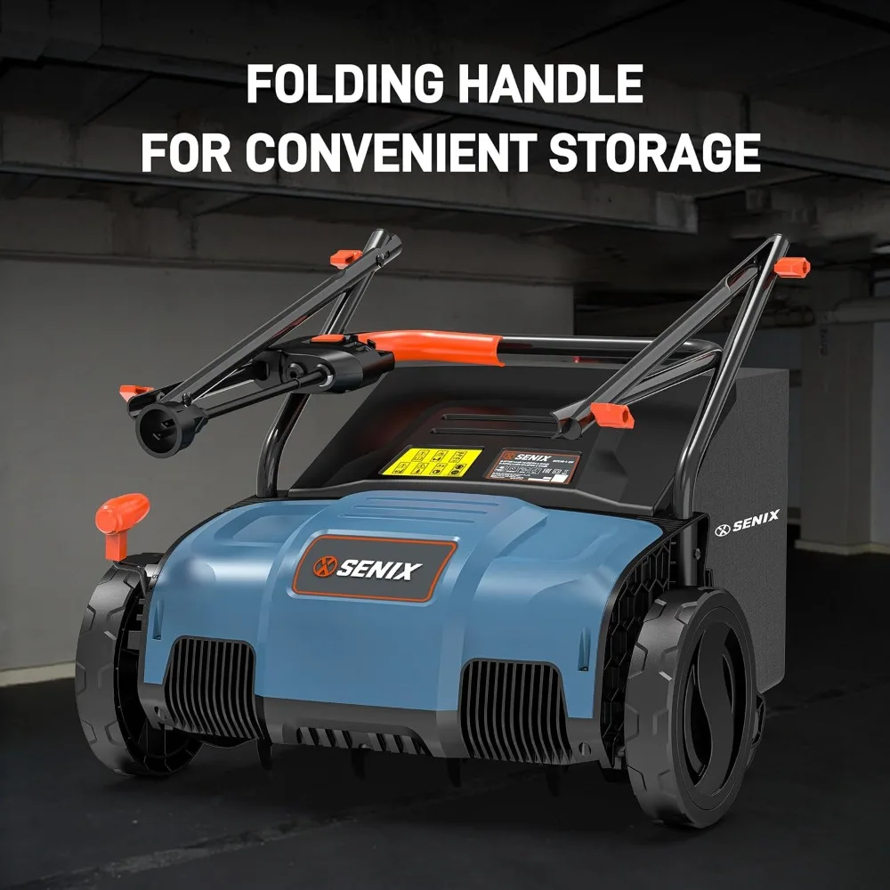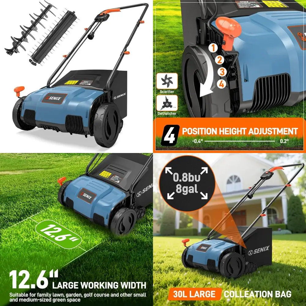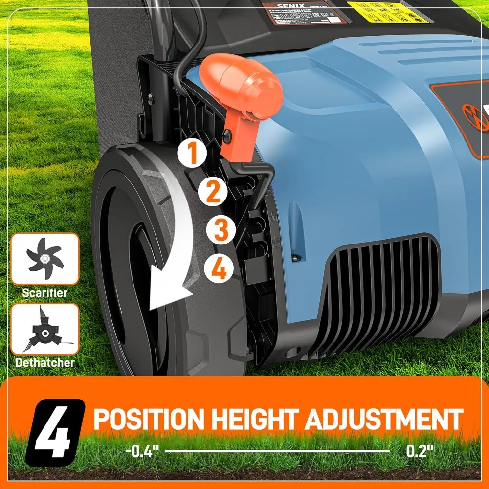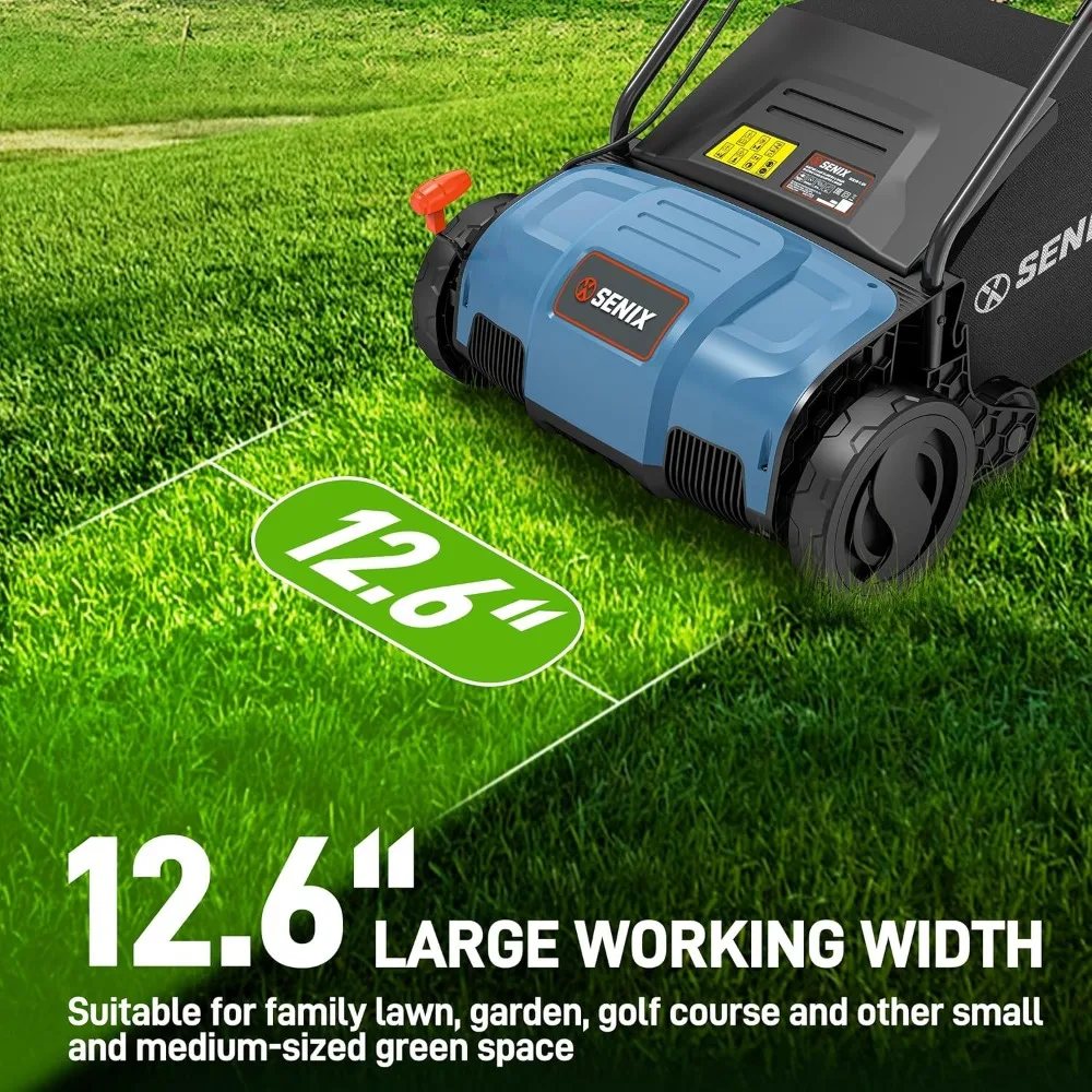 Enhance your lawn's health with the 13-Inch Dethatcher & Scarifier, designed to remove thick layers of thatch with ease, allowing more sunlight, water, nutrients, and air to reach the roots for a stronger and healthier lawn. This efficient tool is powered by a 12-Amp motor, ensuring effective scarifying and dethatching while the 8-gallon collection bag simplifies the cleanup process. The dethatcher is fitted with 27 spring steel tines, offering thorough dethatching at a height of 0.4 inches, making it a superior alternative to traditional thatch rakes. Ideal for outdoor enthusiasts, this 13-Inch Dethatcher & Scarifier also features a 20-blade cylinder for precise 0.4-inch scarifying, promoting optimal lawn health. Backed by a 3-year limited warranty, this product is a reliable choice for maintaining your lawn.