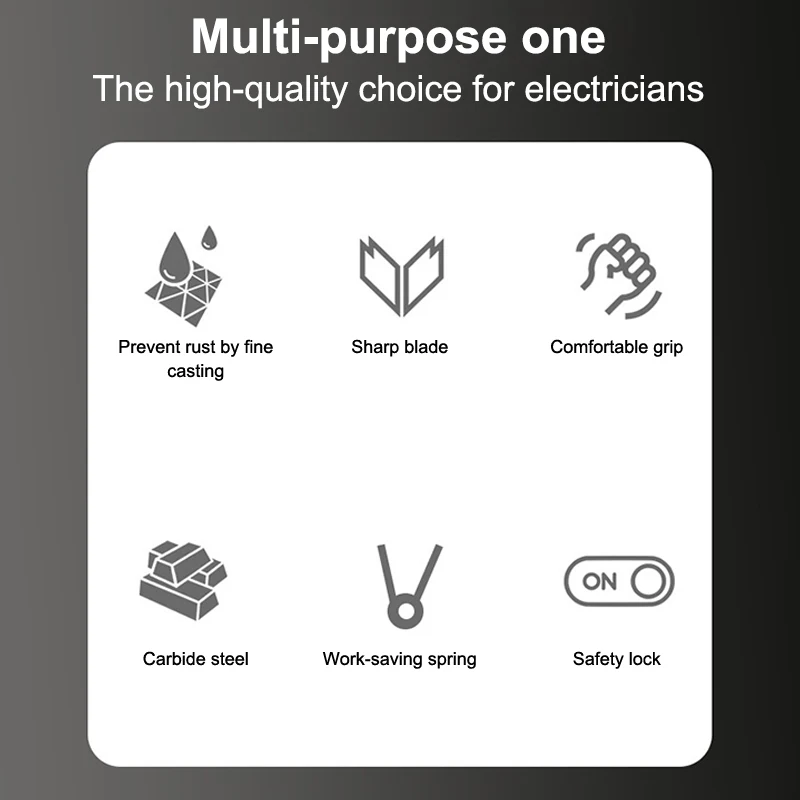 1. Multi-function: This electricist pliers not only contains the functions of stripping, cutting and crimping, but also has the additional functions of winding and dividing. One tool can meet the various needs of cable repair and installation, without the need to purchase additional tools, saving cost and time.