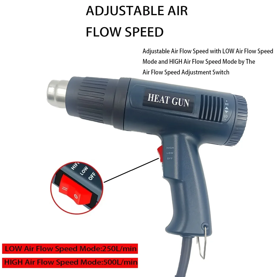 • Robust 2000W powerful motor delivers rapid heating, reaching temperatures up to 600℃ in seconds — ideal for quick and efficient work. • Equipped with advanced overheating protection, this heat gun guarantees safe operation, even during prolonged use, safeguarding both user and device. • Two adjustable settings—select between dual-speed regulation or infinite temperature control—allow you to customize heat output precisely from 60℃ to 600℃, suitable for various materials and applications. • The air flow rate adjustable between 300-500L/min offers optimal control for delicate or heavy-duty tasks.