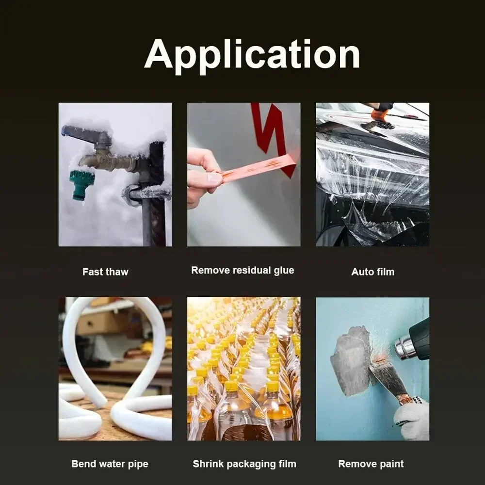 - Removing paint, varnish, or wallpaper adhesive with ease, saving time and effort • Melting or softening adhesives, sealants, and plastics for repair and renovation projects • Thawing frozen pipes, ice, or frozen food safely and efficiently • Heating or shrinking plastic, tubing, or shrink wraps for arts and crafts or packaging • Cleaning rusted metal surfaces or stripping old coatings without damaging underlying material • Repairing electronic devices, such as PCB soldering or component reflow • Automotive applications like removing decals, wrapping film, or defrosting windows • DIY crafts including shrink wrapping, embossing, and plastic molding
