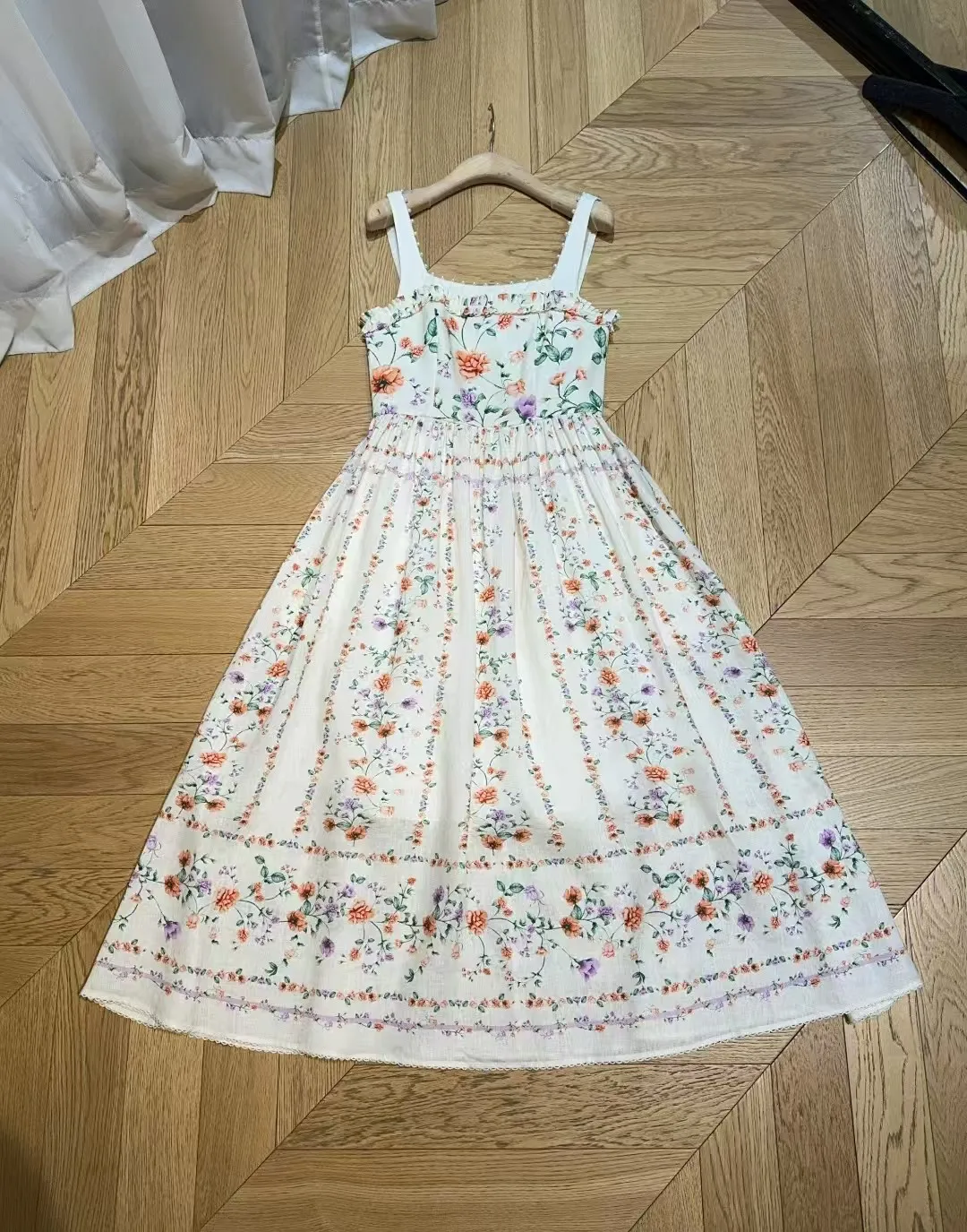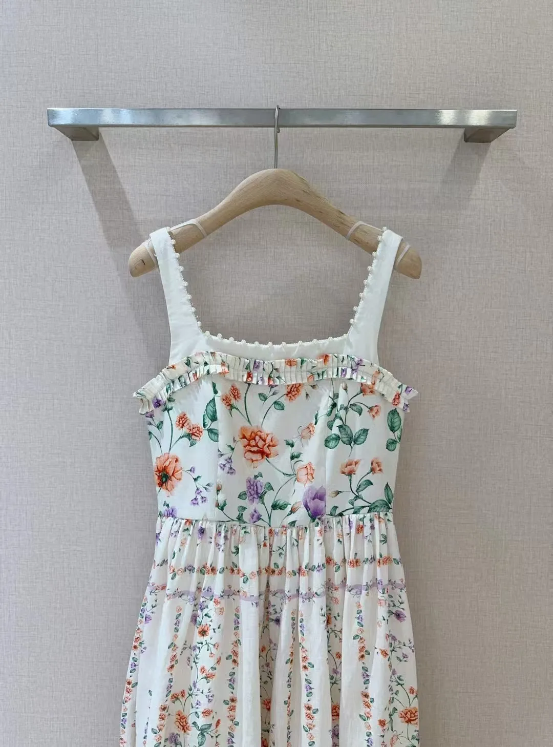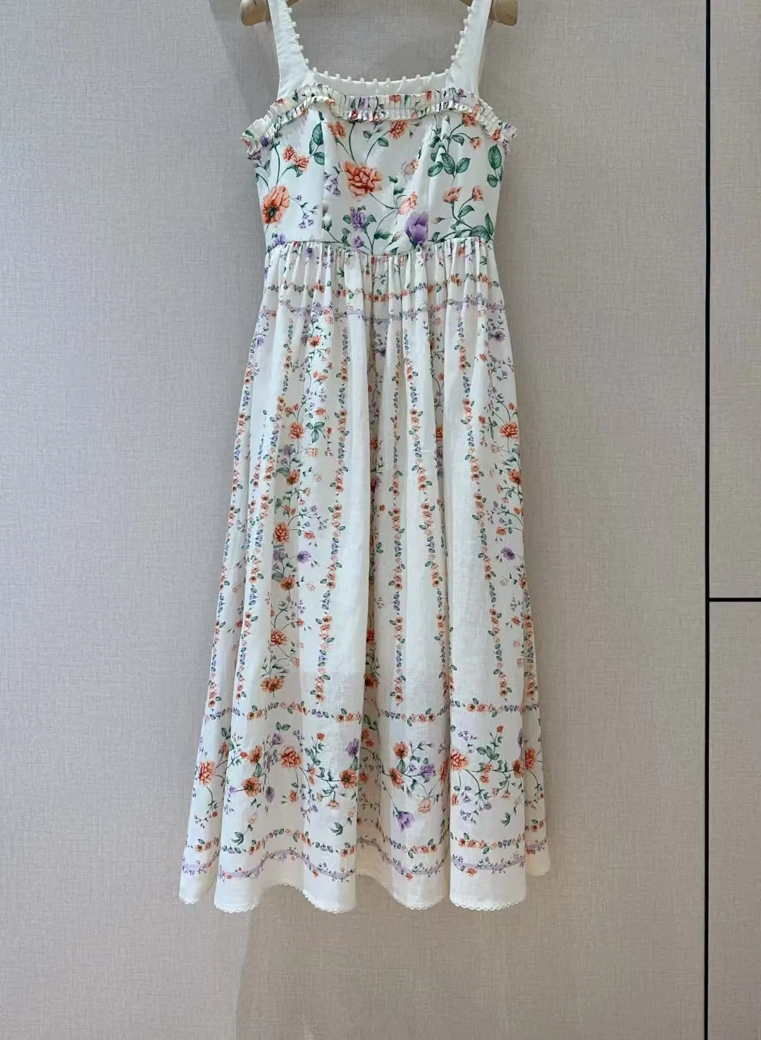Retro camisole dress ???????? Suya wild floral print pattern, linen texture+pearl suspender trim, pleated black fungus edge on the chest, pleated splicing at the mid to high waist hem, very slim and oversized skirt with dreamy elegance and retro fashion