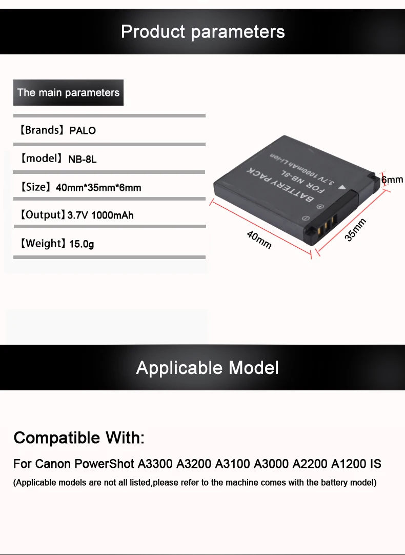 Compatible With:For Canon PowerShot A3300 A3200 A3100 A3000 A2200 A1200 ISModel:NB-8LVoltage :3.7VCapacity: 1000mAhPackage Included:1/2/3/4 x batteries