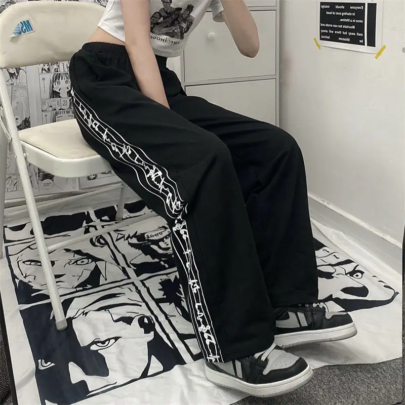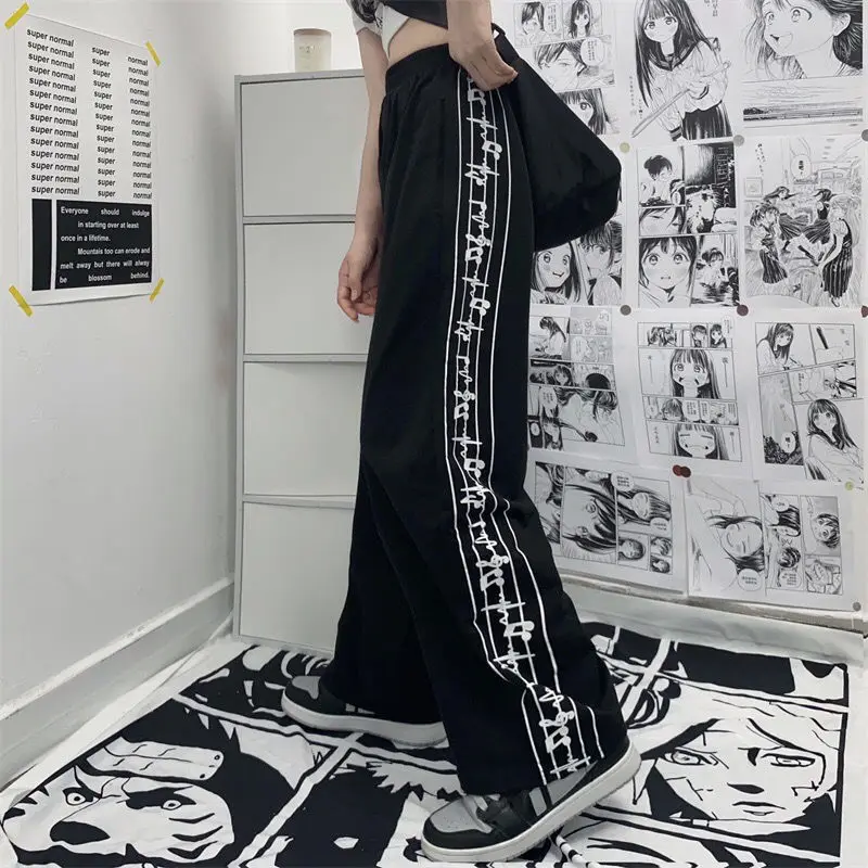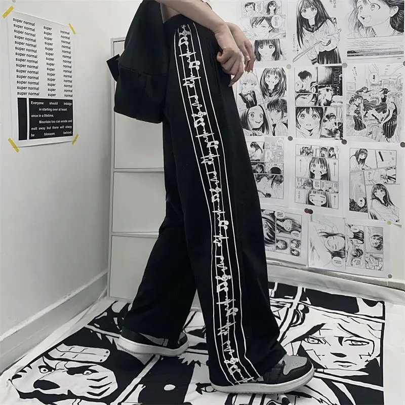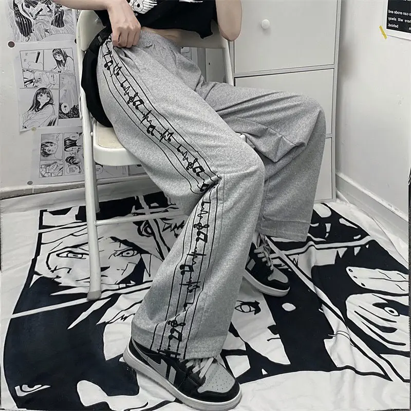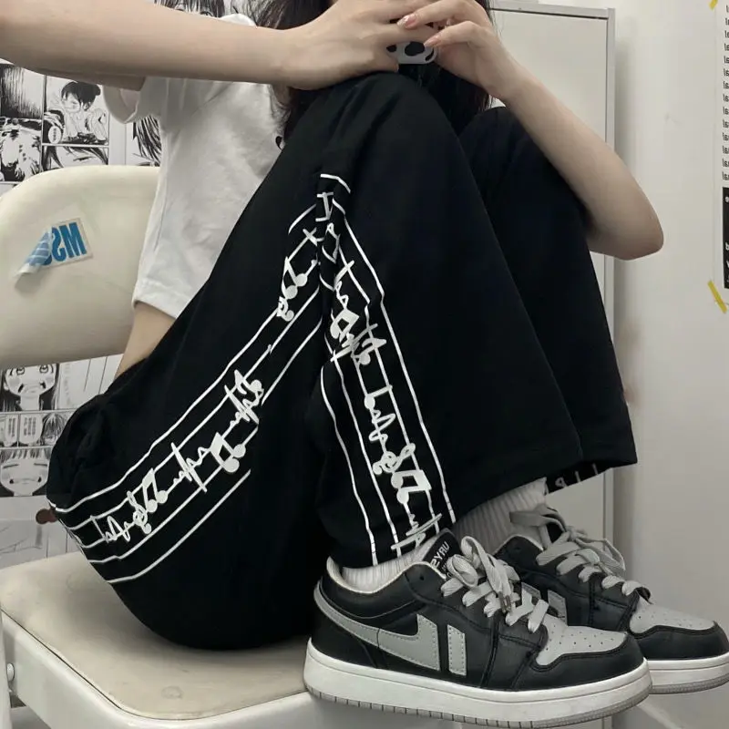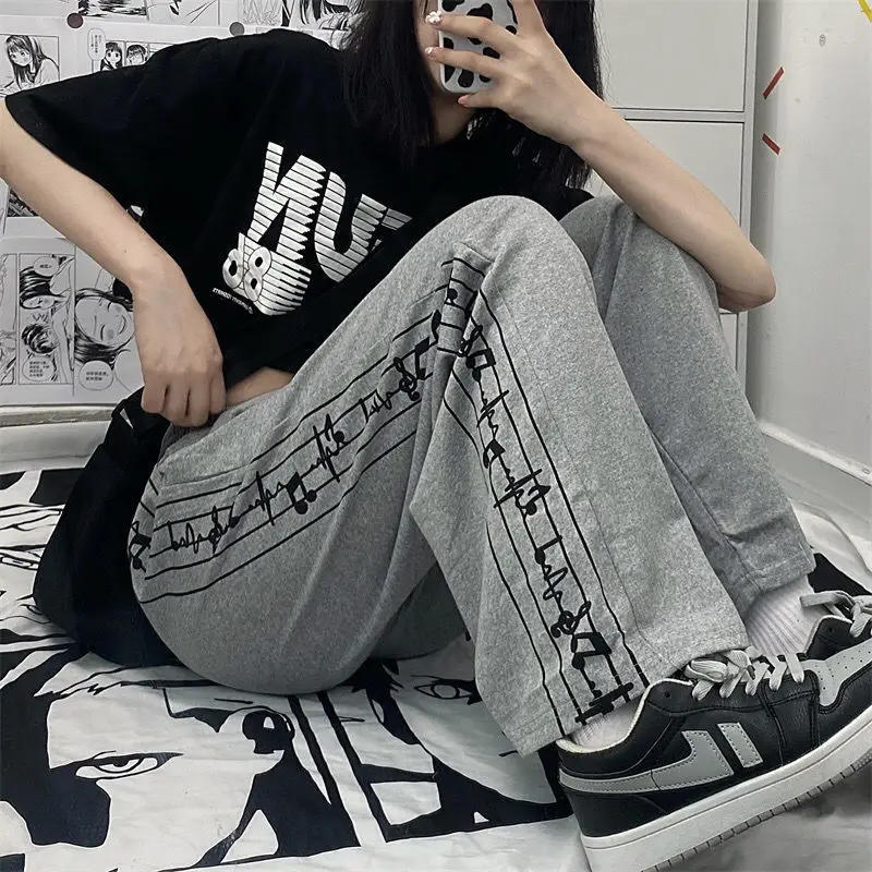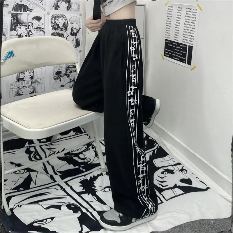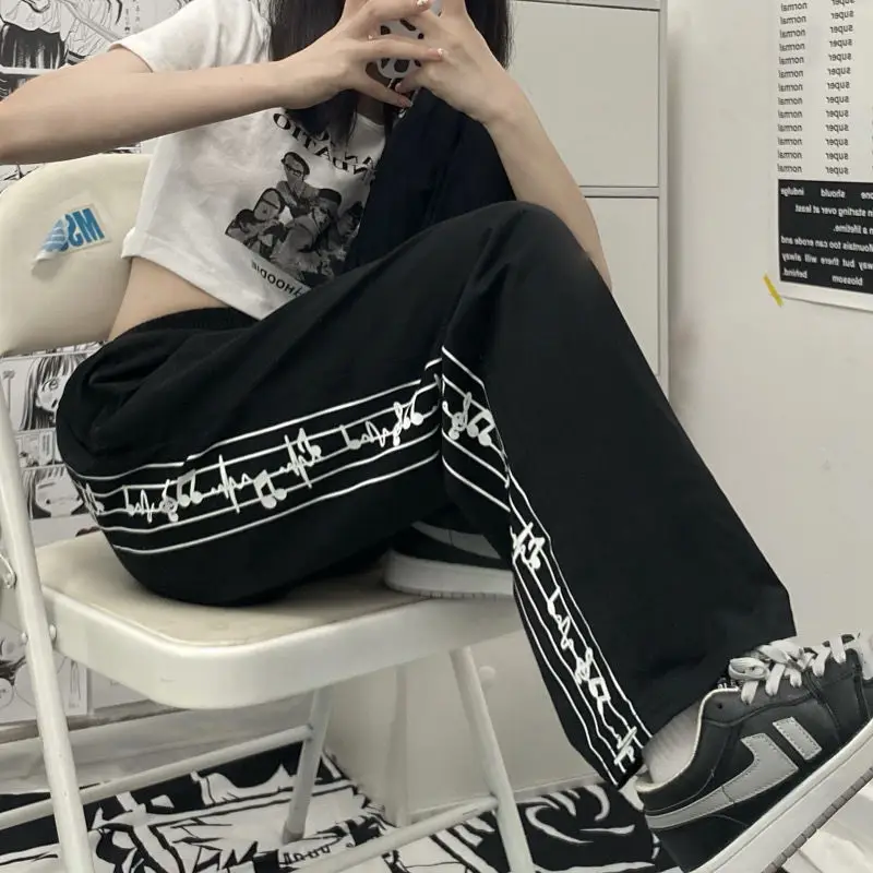 Casual Pants Women Design Note-print Retro Running Trousers Teens Harajuku Streetwear Stylish Elastic Waist Wide Leg Pant Jogger