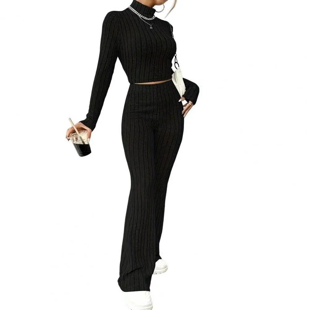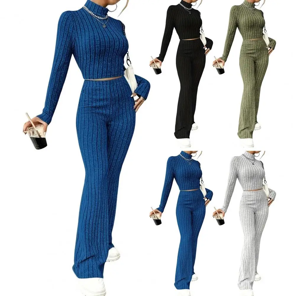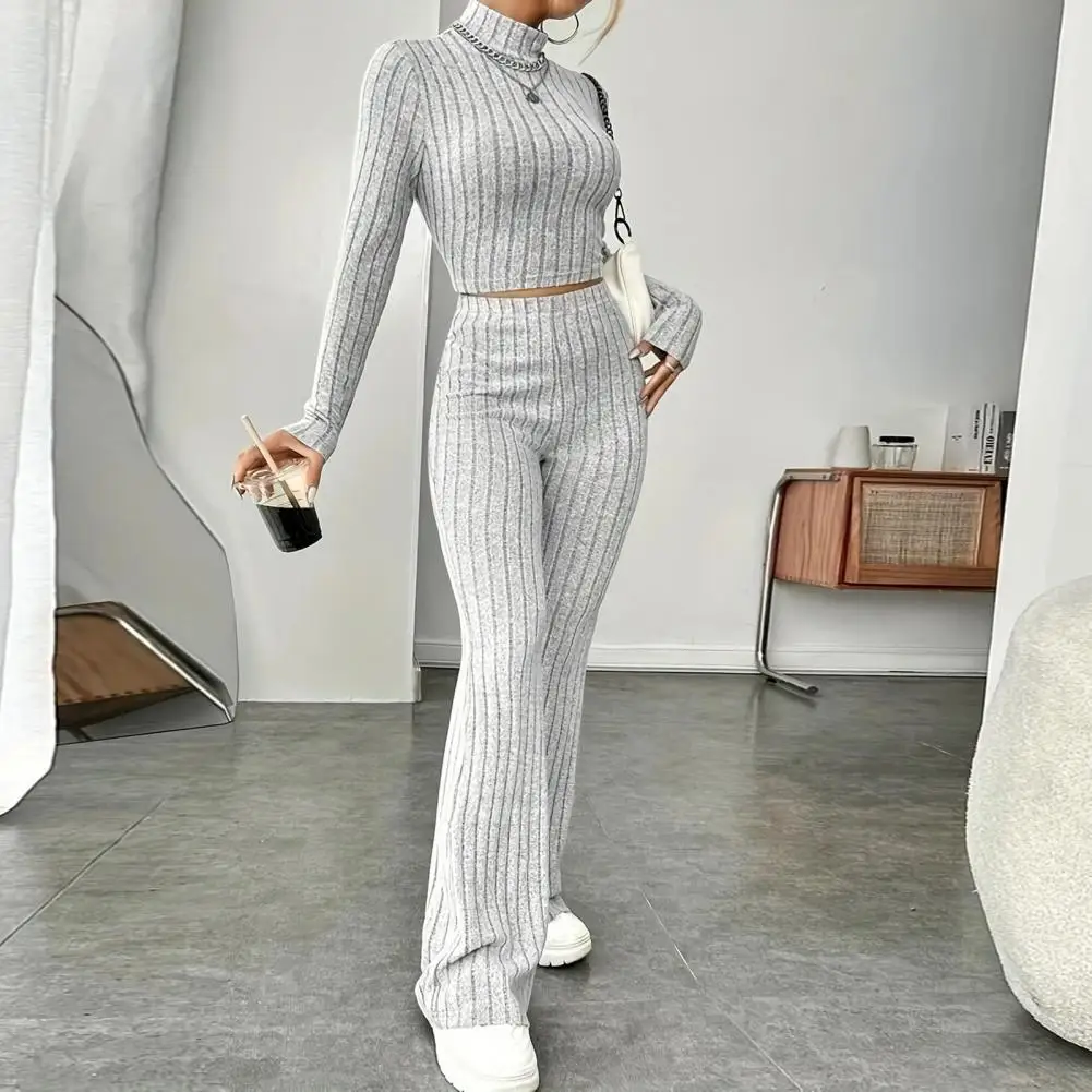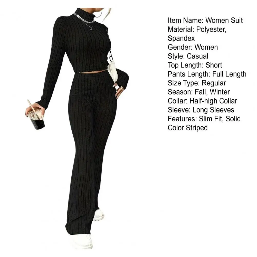 2 Pcs/Set Fall Winter Women Top Pants Set Half-high Collar Long Sleeves Slim Fit Sweatshirt High Waist Solid Color Striped Trousers Set Sport Casual Daily Wear Outfit