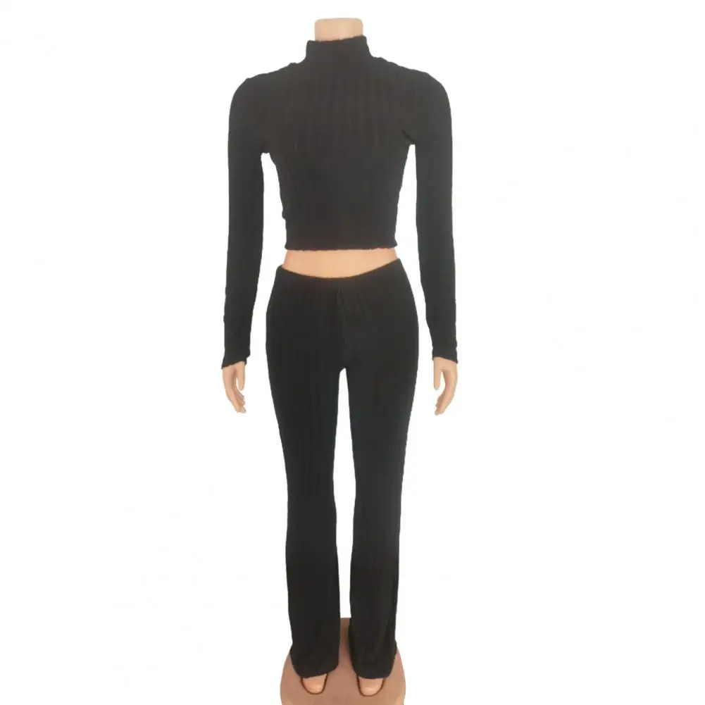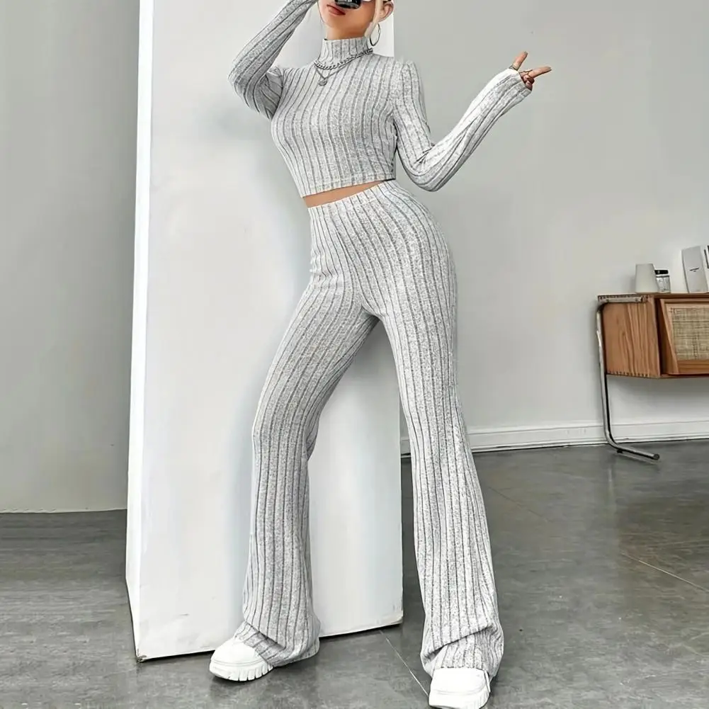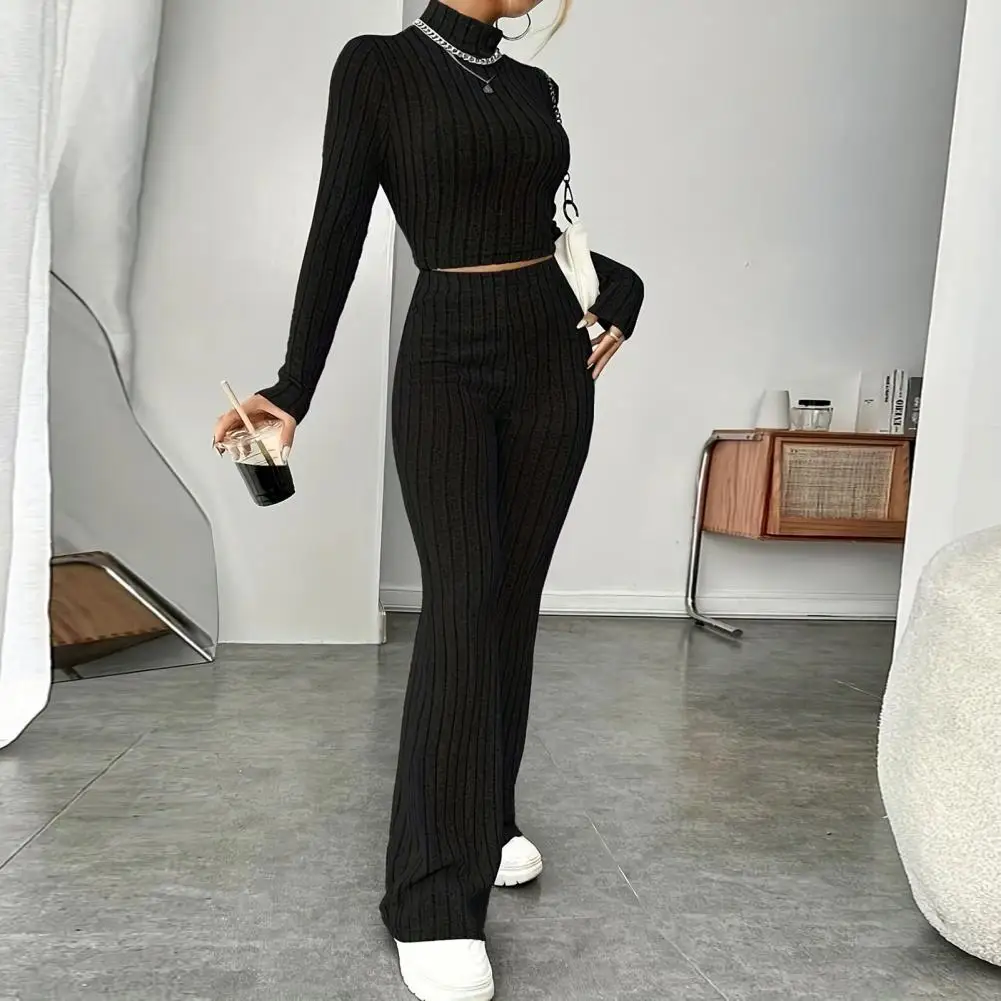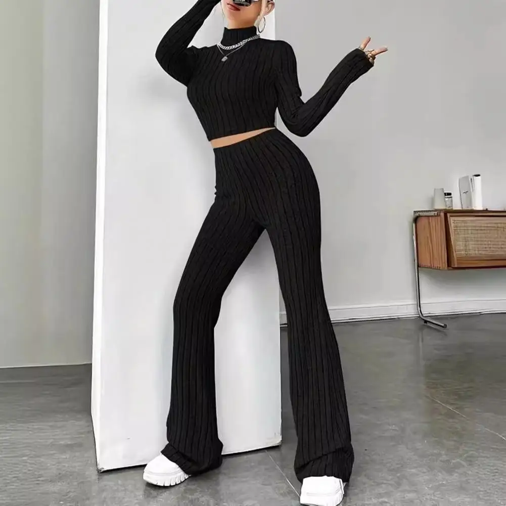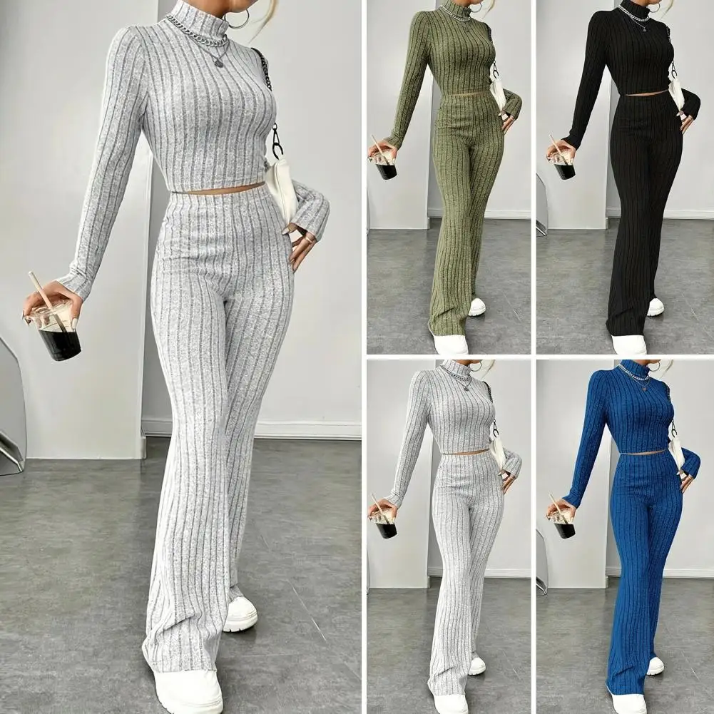 2 Pcs/Set Fall Winter Women Top Pants Set Half-high Collar Long Sleeves Slim Fit Sweatshirt High Waist Solid Color Striped Trousers Set Sport Casual Daily Wear Outfit