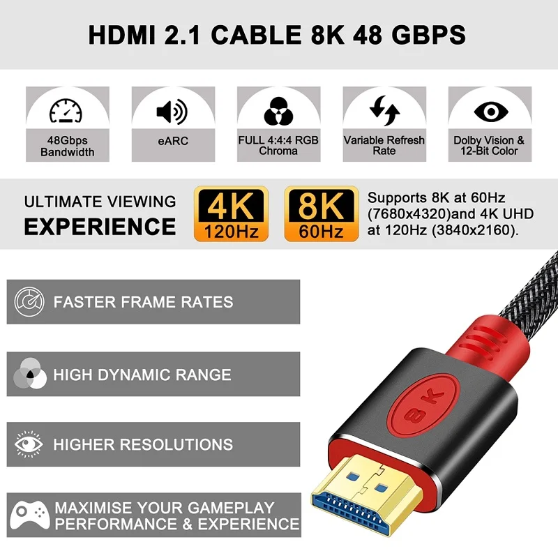 HDMI 2.1 Cable 8K@60Hz 4K@120Hz Ultra ARC HDR High-Speed 48Gbps HDCP2.2