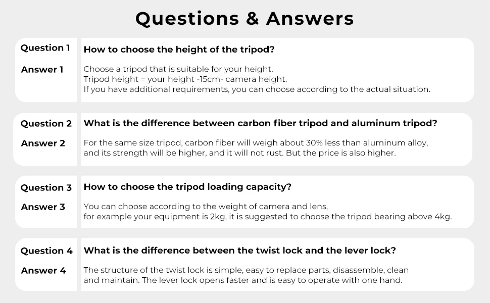 The weight of tripod is 2kg. 25mm large diameter aluminum alloy tube,the load capacity can reach 22.04lbs (10kg), provide security and stability support for your dslr camera.