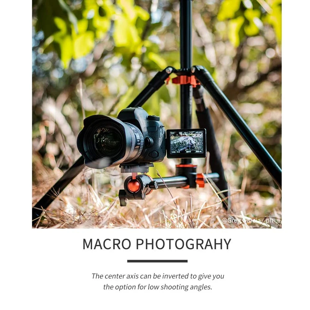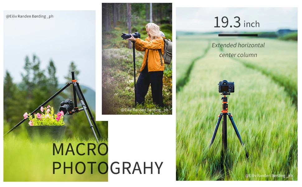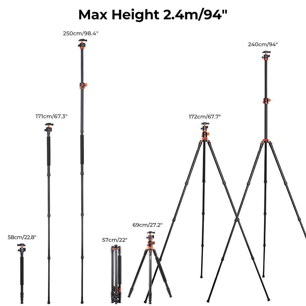 4 sections tube leg and the max diameter is 25mm; Spiral type locking knob allows you to adjust the working height in seconds; The height without column reaches 67.7'' and the height with 2 sections center column is 93.9'',making standing shooting easier.