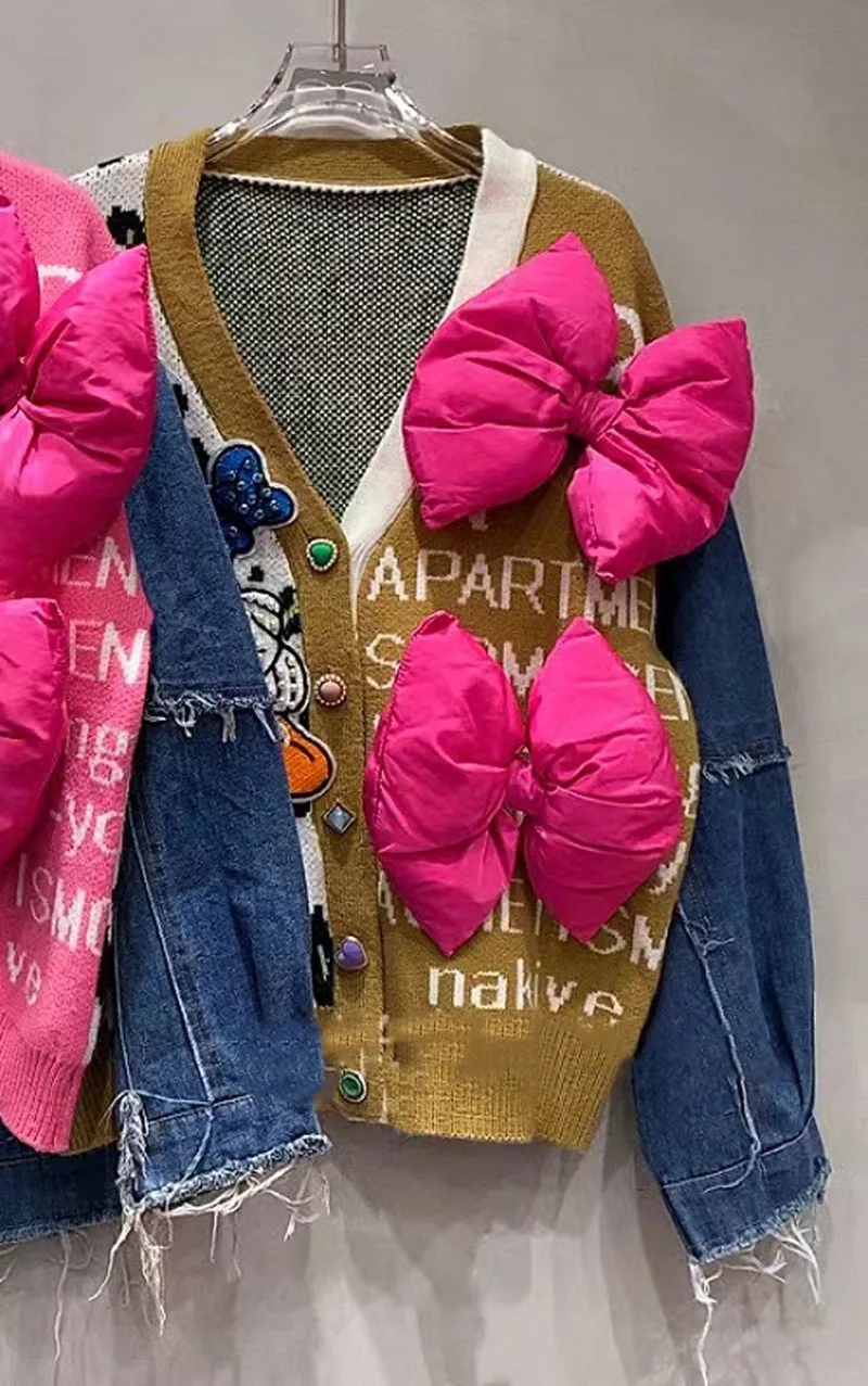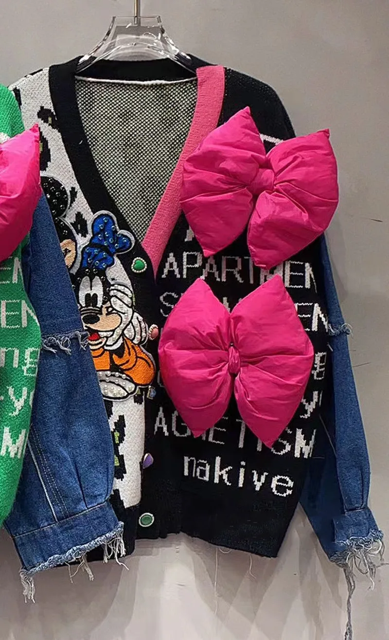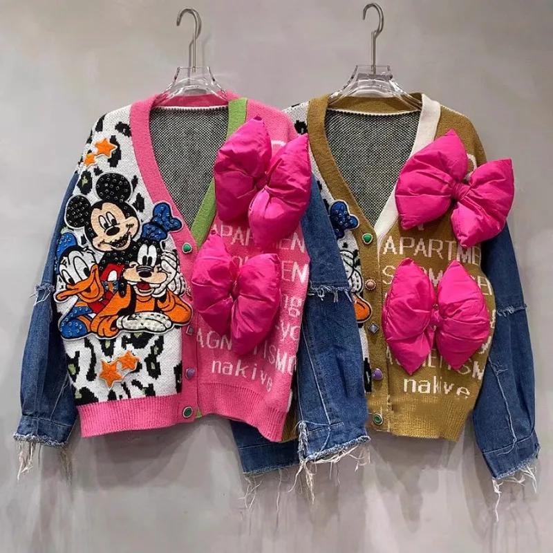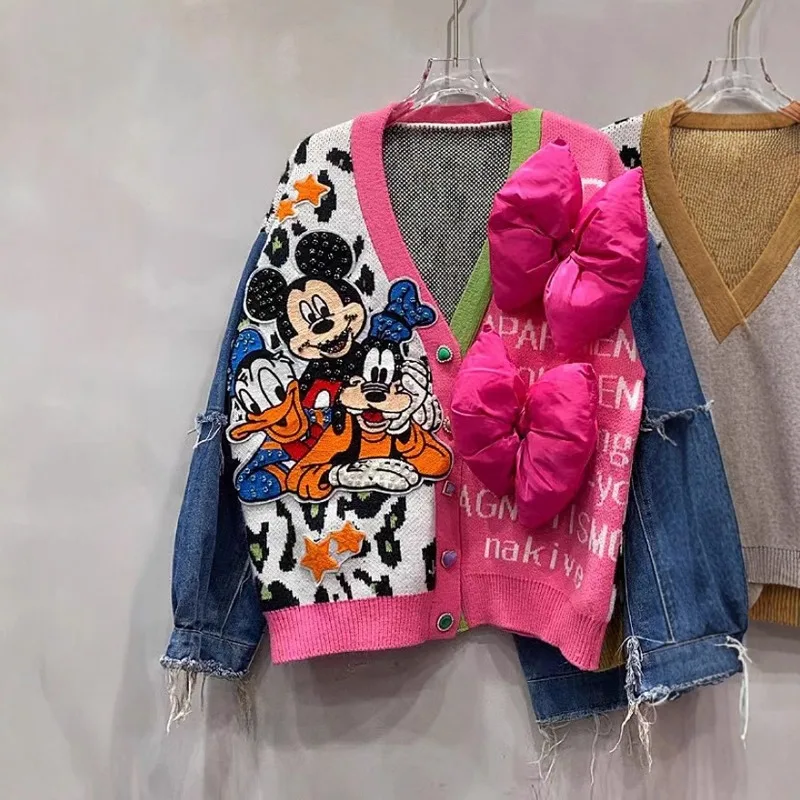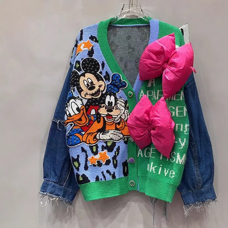 Unique Design Denim Splicing Knitted Cardigan Women's Autumn Winter Loose Contrasting Color Leopard Print V-neck Sweater Jacket